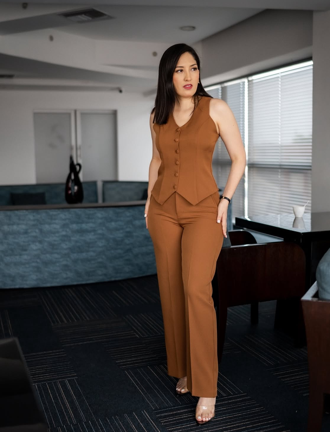 Pantalón con pretina normal y bolsillos, cintura alta y levanta cola